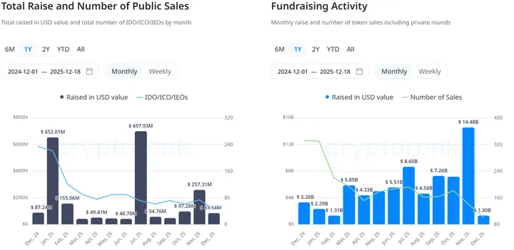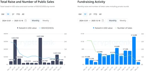 Het trage jaar was ook duidelijk zichtbaar bij nieuwe launches. In december werden via community sales slechts 101 tokens gelanceerd, goed voor 1,3 miljard dollar opgehaald kapitaal – een fractie van de 14 miljard in november,
