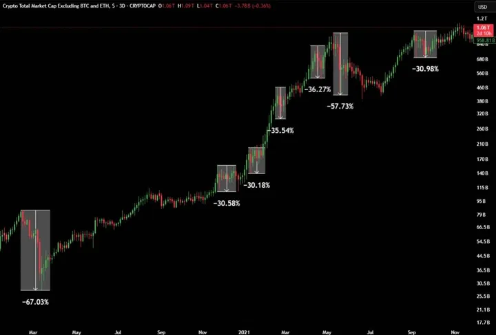 Tijdens de pandemiecrash van maart 2020 verloor de markt bijna 70% van haar waarde, terwijl in mei 2021 nog eens ruim 50% werd weggevaagd. Ook in de vorige bullrun zagen we zeker vijf correcties van 30% tot 40% bij