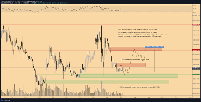 “Hoogstwaarschijnlijk het dieptepunt bereikt, net als EGLD. Een hertest van het blok, dat het blok was voorafgaand aan de rally. Sindsdien trending naar beneden, maar als we nog een keer steun vasthouden en/of kritieke weerstand kraken -> zal een nieuwe opwaartse trend beginnen."