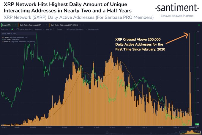 “XRP houdt beter stand dan de meeste altcoins tijdens de daling van crypto op donderdag. Een paar dagen geleden explodeerde het XRP-netwerk met unieke adressen die op het netwerk interageren, voor het eerst sinds februari 2020 meer dan 200.000. Dit is het bekijken waard.”