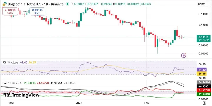 toont een sterke neerwaartse trend (ADX/ADXR hoog, +DI laag). Als verkoopdruk aanhoudt, test DOGE mogelijk $0,08–$0,09. Als futures-kopers winnen, kan $0,12 in zicht komen.