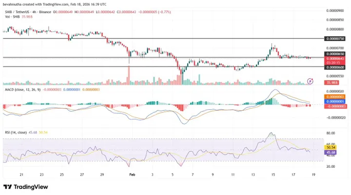 De grafiek oogt vlak. SHIB consolideert tussen steun rond $0,00000600 en weerstand op $0,00000750. Al dagen geen echte doorbraak in welke richting dan ook.