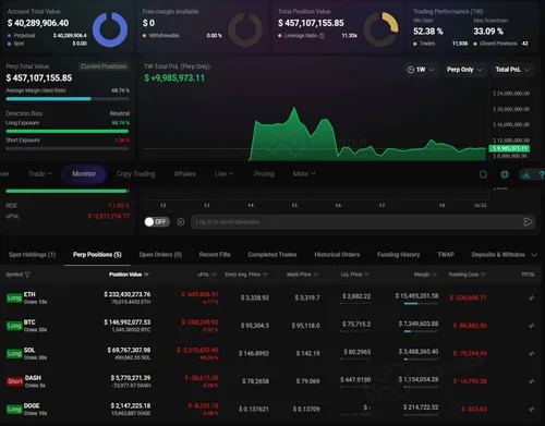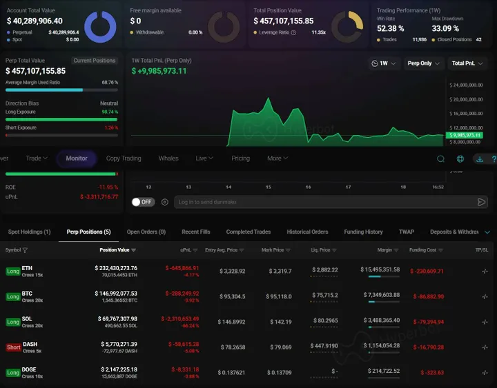 De whale houdt het niet bij memecoins. De rest van de actieve perpetuals ziet er als volgt uit (allemaal long):