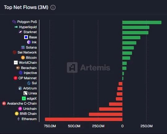 POL) sluit de laatste drie maanden af als absolute koploper in netto-instroom onder alle blockchains. Meer dan $407 miljoen aan kapitaal vloeide netto naar het netwerk – een ruime voorsprong op de rest van het veld.