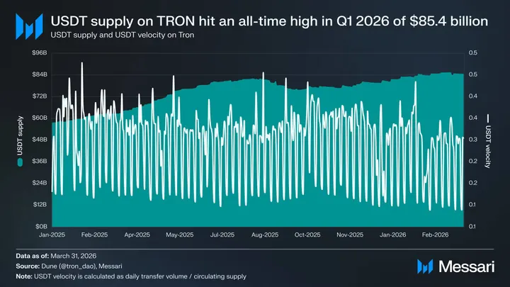 Volgens recente data groeide de stablecoinmarkt op TRON aan het einde van het eerste kwartaal van 2026 naar 85,8 miljard dollar, waarvan bijna alles uit USDT bestond. In datzelfde kwartaal liep het cumulatieve USDT-transfervolume op het netwerk op naar ongeveer 2,0 biljoen dollar.