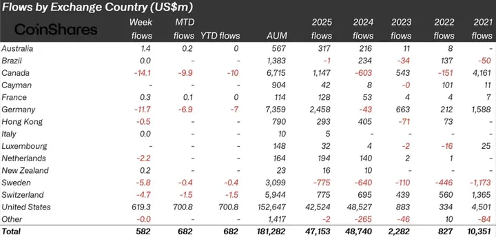 De Verenigde Staten blijven veruit de grootste speler, met $42,5 miljard aan instroom in 2025. iShares was de grote winnaar onder de aanbieders: $346 miljoen in de laatste week en al $336 miljoen deze maand. Over heel 2025 haalde iShares $35,1 miljard op, minder dan de $40,8 miljard in 2024.