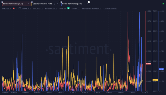 XLM en SNT omvatten. Dit kan wijzen op een komende prijsstijging; Santiment-analisten waarschuwen echter dat hier een addertje onder het gras zit.