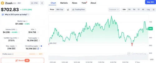 Zcash brak in oktober door acht jaar oude pieken en versloeg Monero (XMR) als grootste privacymunt qua marktkap. Nu noteert ZEC rond de 702 dollar, met een 24-uurs stijging van 3,55% en een weekwinst van 9,1%. De maandelijkse plus? Ruim 236%.