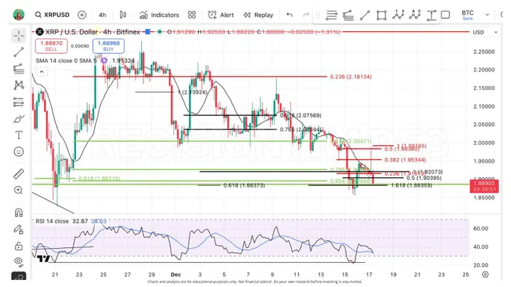 Op de 4-uursgrafiek van XRP zie je een dalend patroon vanaf rond $2,18, met lagere toppen en omgeslagen moving averages die bearish momentum bevestigen. De prijs zit nu in een cluster van Fibonacci-levels tussen $1,88 en $1,91 – waar de 0.618 en 0.786 retracements samenkomen. Dat maakt $1,88 extra belangrijk.
