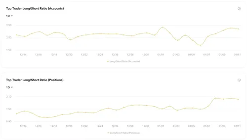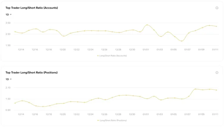 Maar liefst 76,16% houdt longposities aan, tegenover slechts 23,84% short. Dat levert een long/short account-ratio op van 3,19 – een van de meest bullishe standen in maanden.