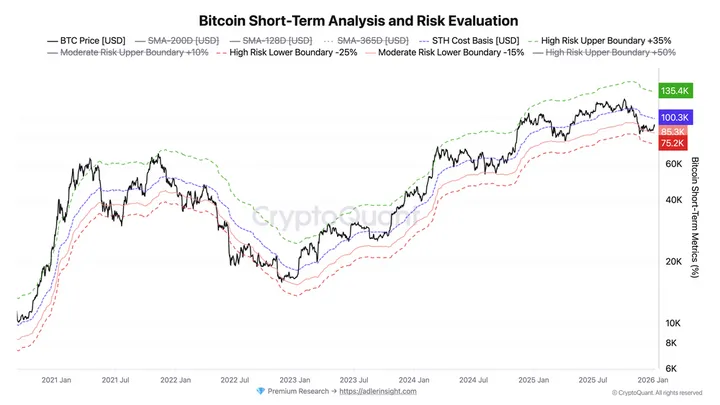 Rond de huidige niveaus bij $91.000 zit Bitcoin in een zone met matig risico. Dat ligt tussen de STH cost basis en de -15% ondergrens.