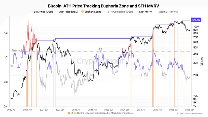 Adler zoomt ook in op een andere belangrijke indicator: de grafiek met all-time highs, euforiezones en de STH MVRV-ratio. Die meet hoe de marktprijs zich verhoudt tot de gemiddelde aankoopprijs van kortetermijnbeleggers.
