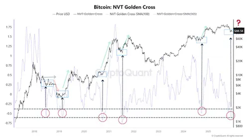 On-chain data van CryptoQuant versterken het positieve beeld. De NVT Golden Cross – die marktkapitalisatie vergelijkt met netwerkgebruik – is diep in negatief terrein gedoken, naar niveaus rond -0,6 tot lager.