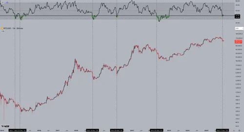 toont namelijk aan dat de Relative Strength Index (RSI) van BTC/USD op de wekelijkse grafiek is gezakt naar niveaus die we sinds begin 2023 niet meer zagen.