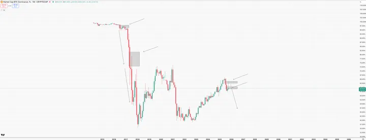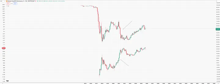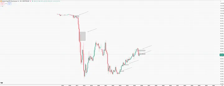 duidelijk in eerdere cycli. Telkens nadat Bitcoin Dominance een piek bereikte