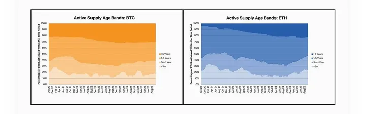 Ether doet het omgekeerde. Langetermijnbezitters activeren oude munten drie keer sneller dan bij BTC, een teken van nutsgedrag in plaats van hamsteren, volgens Keyrock.