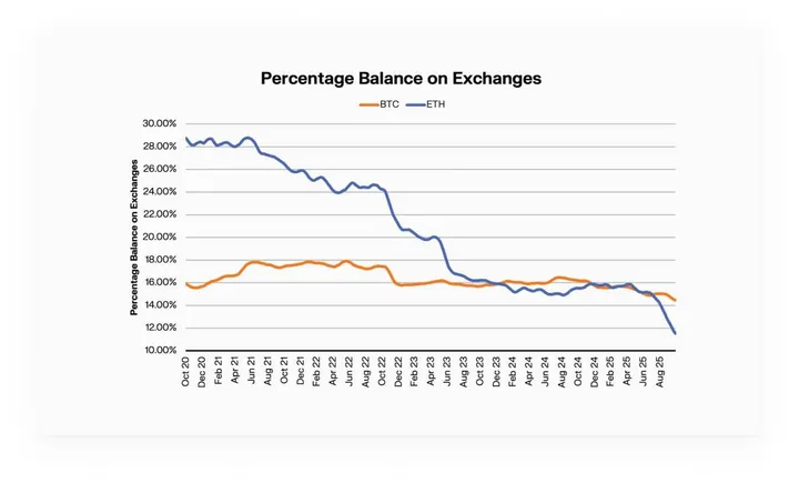 De saldi op beurzen krimpen hard: Bitcoin met 1,5 procent, Ether zelfs met bijna 18 procent. Munten stromen naar spot-ETF's en institutionele bewaring, wat analisten zien als de grootste structurele wending.