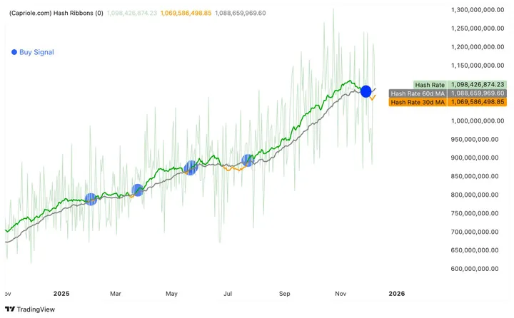 De Hash Ribbons kijken puur naar de hashrate van het netwerk. Als het 30-daagse gemiddelde onder het 60-daagse gemiddelde duikt, is dat het teken dat een deel van de miners de mijnwerkers de handdoek in de ring gooit. Ze draaien verlies, verkopen hun pas geminede