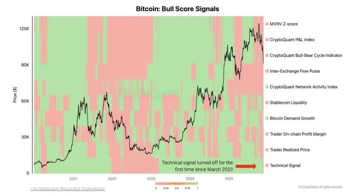 Wat deze correctie anders maakt dan de dips van de afgelopen twee jaar? Zowel de on-chain data als de technische plaatjes kleuren donkerrood. Vorige week zakte de Bull Score Index van CryptoQuant keihard naar 20 uit 100 – een niveau dat je normaal alleen ziet in écht barre tijden.