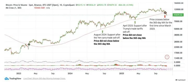 Juist dat gemiddelde hield stand tijdens alle correcties eerder in deze cyclus, maar gaf wél de start van de bearmarket in 2022 aan. Dat maakt deze doorbraak extra pijnlijk. De analist van CryptoQuant zegt: