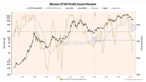 het duidelijkste signaal momenteel uit de on-chain hoek. De marktstructuur oogt beter dan tijdens de heftigste fase van de daling, wat erop wijst dat de grootste stress uit het systeem begint te lopen.