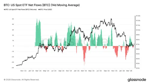 Er is wel één plek waar de schade iets minder oogt. Glassnode ziet dat de 14-daagse gemiddelde flows van Amerikaanse spot-bitcoin-ETF’s weer zijn omgeslagen naar bescheiden netto-instroom na een langere periode van uitstroom. Dat is directioneel beter nieuws, maar Glassnode zet er meteen de rem op: dit lijkt voorlopig meer op vroege stabilisatie dan op een overtuigende terugkeer van institutionele vraag.