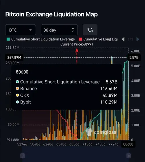 De liquidatie-heatmap laat zien dat een doorbraak boven $80.500-83.000 zomaar $5,7 miljard aan shorts kan liquideren – dat zou een flinke boost kunnen geven.