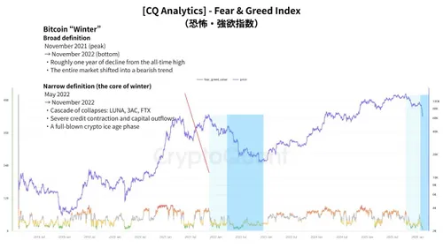 De grafiek in het rapport combineert prijs met deze index en markeert de brede en smalle definities van de laatste echte winter, met zware klappen door LUNA, 3AC, FTX en kredietkrimp.