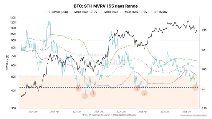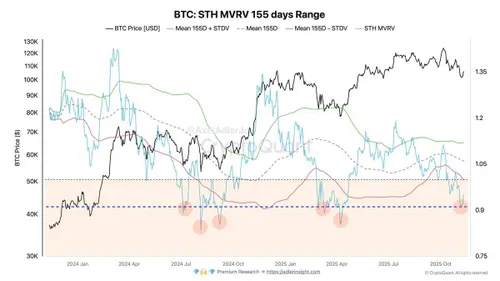 De Short-Term Holder MVRV-ratio (STH MVRV) raakte op 7 november een dieptepunt van 0,9124 – bijna de bodem van de historische band.