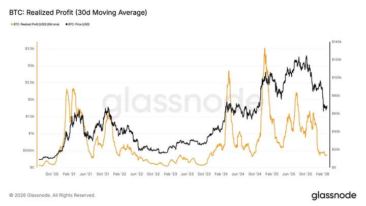 Tegelijk is de 30-daagse SMA van realized profit met ongeveer 63% teruggevallen, wat volgens het bedrijf wijst op een duidelijke verzwakking van de koopzijde. De markt oogt daardoor stabieler dan een paar weken geleden, maar nog niet sterk genoeg om van een bevestigde trendomslag te spreken.
