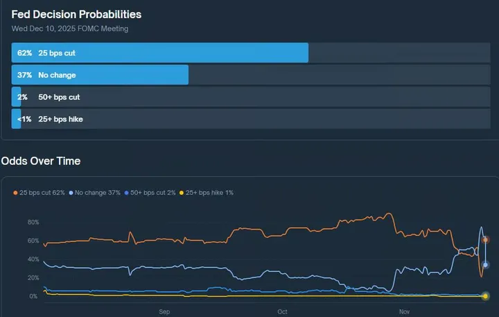 Voor de speech van Williams stonden de books op Polymarket er somber voor. De kans op geen renteverlaging in december was opgelopen tot ruim 60 procent, met odds voor een 25 basispunten-korting die krompen.