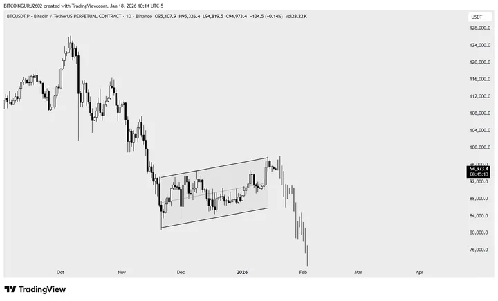 @guru2602 op X) deelt een scherpe technische take die veel aandacht trekt. Wat velen zagen als "gezonde consolidatie" in een stijgend kanaal sinds november 2025? Volgens hem is het een laat-stadium distributiefase – klassiek teken dat slimme money aan het uitstappen is terwijl FOMO-bulls nog instappen.