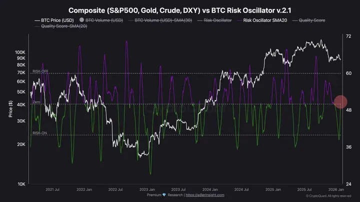 wijst op risk-off signalen in de Composite vs BTC-risicooscillator (rond 52) en onchain-druk (boven 34). Zolang verkoopdruk hoog blijft, is een duurzame trenduitbraak lastig.