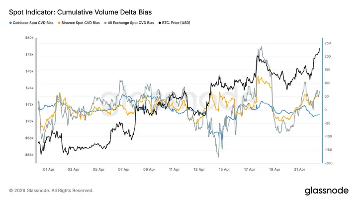 Het bullish deel is er namelijk wel degelijk. Glassnode ziet dat de spotvraag verbetert. De cumulative volume delta is op grote beurzen weer positief gedraaid, wat erop wijst dat de recente stijging niet alleen door derivaten wordt gedragen. Opvallend daarbij is dat vooral Binance veel van die koopdruk liet zien, terwijl Coinbase relatief gematigd bleef. Dat wijst eerder op bredere marktdeelname dan op puur Amerikaanse institutionele koopkracht.