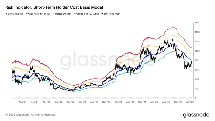 Volgens Glassnode is dat geen detail. Bitcoin is namelijk opnieuw boven de True Market Mean van $78.100 uitgekomen, een niveau dat vaak het verschil markeert tussen een zwakke markt en een constructievere fase. Dat klinkt bullish, en dat is het ook. Alleen ligt de echte test iets hoger: rond $80.100 begint de Short-Term Holder Cost Basis, de gemiddelde aankoopprijs van beleggers die in de afgelopen 155 dagen hebben gekocht. En juist daar wordt het vaak lastig.