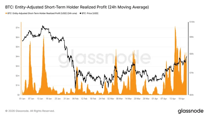 Sterker nog: die winstnemingen zijn al begonnen voordat $80.100 echt is gebroken. Glassnode zag de Short-Term Holder Realized Profit oplopen naar $4,4 miljoen per uur. Dat is bijna drie keer hoger dan de $1,5 miljoen die eerder dit jaar telkens opdook bij lokale toppen. Dat is geen onschuldig detail. Het betekent simpelweg dat een deel van de markt de huidige kracht nu al gebruikt om risico af te bouwen.