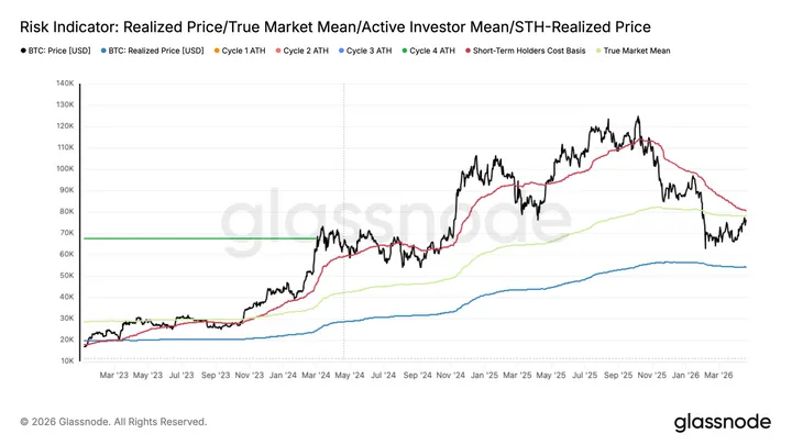 Glassnode waarschuwt ook expliciet dat rallies richting de Short-Term Holder Cost Basis in zwakkere marktfases vaak meerdere pogingen nodig hebben. Tussen die tests in viel bitcoin geregeld terug richting lagere bandbreedtes. Daarbij noemt het rapport $69.900 als onderliggende referentiezone en $70.000 als een zich ontwikkelende middellange steunvloer. Voor de kortere termijn ziet Glassnode bovendien een verhoogd neerwaarts versnellingsrisico als bitcoin terugzakt richting het midden van de $75.000-zone.