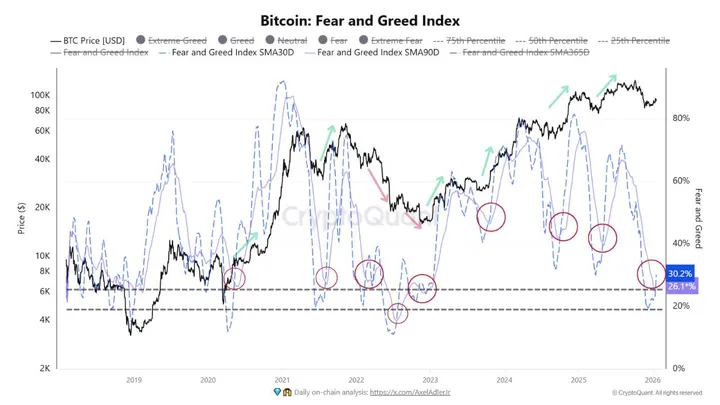 Een ander signaal van CryptoQuant: het 30-daags gemiddelde van de Fear & Greed Index is boven het 90-daags gemiddelde geklommen, voor het eerst sinds mei 2025.