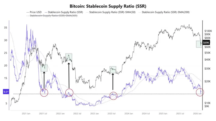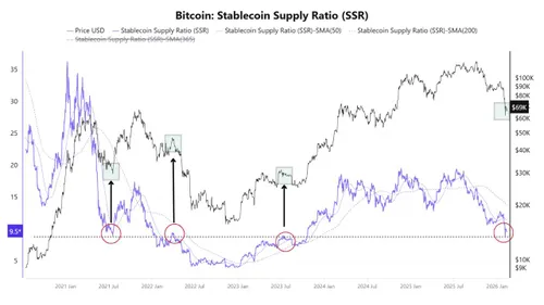MorenoDV: de Stablecoin Supply Ratio (SSR) zweeft nu rond de 9,5-9,6. Deze ratio vergelijkt de market cap van Bitcoin met het totale stablecoin-aanbod – kort gezegd: hoeveel 'droog poeder' (koopkracht in USDT, USDC etc.) er nog klaarligt.