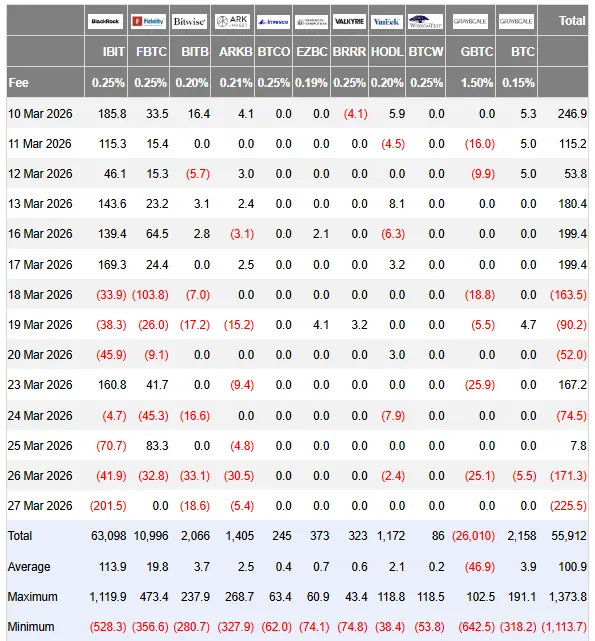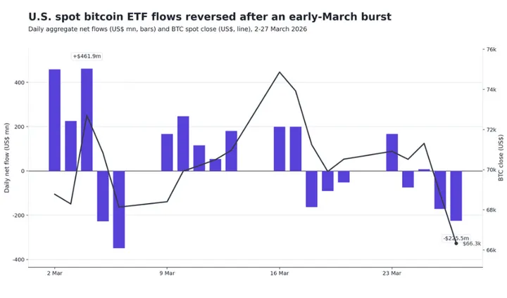 Bitcoin oogt broos. De koers noteert zondag rond $66.486 en blijft daarmee dicht bij de onderkant van de recente range hangen. Tegelijk kregen de Amerikaanse spot-Bitcoin-ETF’s vrijdag opnieuw een tik: op 27 maart 2026 stroomde er netto $225,5 miljoen uit de fondsen, waarvan $201,5 miljoen uit BlackRock’s IBIT kwam. Dat is goed voor ruim 89,3% van de totale uitstroom die dag.