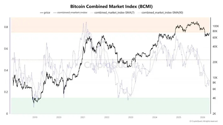 wijst erop dat de Bitcoin Cycle Market Indicator, de BCMI, is teruggevallen naar de 0,2 tot 0,3-zone. Historisch viel dat gebied vaker samen met periodes waarin bitcoin als diep ondergewaardeerd werd gezien.