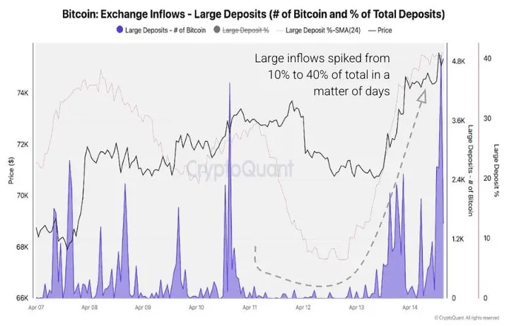 Waar het kortetermijnrisico het duidelijkst zichtbaar wordt, is in de activiteit van grote spelers. CryptoQuant-data laten zien dat de exchange inflows opliepen tot 11.000 BTC, het hoogste niveau sinds december 2025. Tegelijk bereikten de stortingen van grote holders het hoogste punt sinds juli 2024.