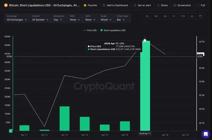 Dat gebeurde terwijl bitcoin rond een belangrijke on-chain weerstand van ongeveer 76.800 dollar handelde.