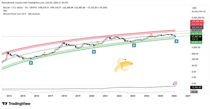 Peter Brandt is iets minder extreem: hij ziet $42.000 als mogelijke bodem als Bitcoin diep in de "bananenschil" (zijn term voor historische bear-ondersteuning) graaft. "We zijn er bijna", tweet hij. Hij verwerpt hoofd-en-schouderspatronen die naar $25.000 wijzen – het is eerder een verbredende top met vlag, volgens Brandt.