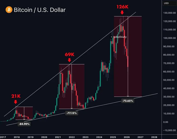 ziet Bitcoin de macrostructuren van 2017 en 2021 herhalen: na pieken van $21.000 (2017) en $69.000 (2021) volgden dalingen van 84% en 77%. Als dit patroon symmetrisch doorgaat vanaf $126.000, zou
