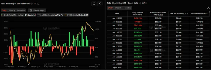 Bitcoin ETF’s woensdag een netto-uitstroom van $137,77 miljoen. Dat was de derde opeenvolgende dag van uitstroom deze week. Tegelijk wijst FXStreet op een hawkish Fed-toon en onzekerheid rond de gesprekken tussen de VS en Iran als extra rem op risk-on sentiment.