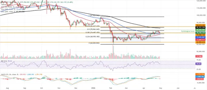 Breekt BTC overtuigend boven $78.197, dan komt $80.000 opnieuw in beeld. Gaat $75.000 verloren, dan neemt volgens MarketPulse de kans toe op een snellere terugval richting ongeveer $73.500.