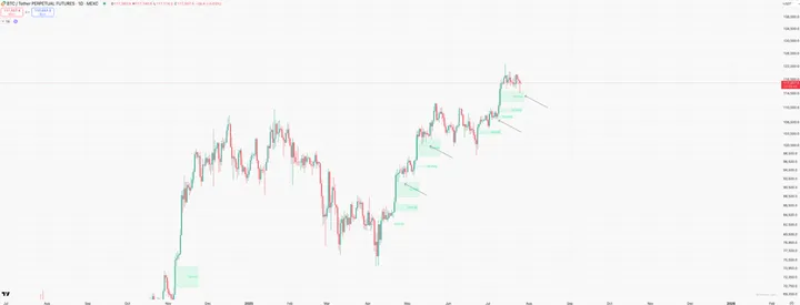 bredere patroon dat Bitcoin sinds april heeft gevormd: vrijwel elke impuls