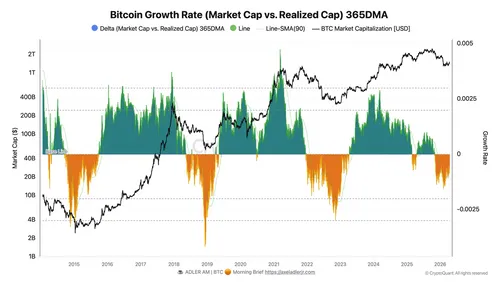 De eerste waarschuwing zit in de Realized Cap. Adler schreef deze week dat die sinds januari 2026 met 3,23 procent is gedaald. Die metric kijkt niet naar de gewone beurskoers, maar naar de on-chain kostprijs van coins en geeft daarmee een beeld van hoeveel kapitaal er feitelijk in het netwerk zit. Zolang die basis krimpt, is er volgens hem nog geen overtuigend signaal dat bitcoin alweer in een nieuwe expansiefase zit.