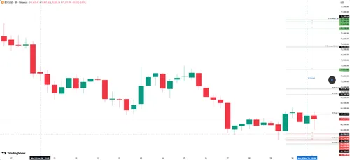 Een recente analyse op TradingView zet het huidige herstel vooral neer als een tactische opleving binnen een bredere neerwaartse trend. In dat beeld geldt de zone rond $67.466 als eerste niveau dat heroverd moest worden, terwijl $71.621 naar voren komt als belangrijke weerstand en logisch winstdoel als bitcoin verder oploopt.